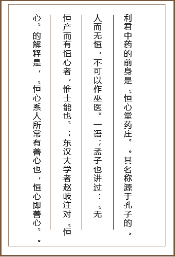 利君中藥具有近400年的悠久歷史。公司前身“恒心堂藥莊”始創(chuàng)于明朝末期,興盛于清代、民國,其招牌產(chǎn)品“坎壢妙濟(jì) 丹”、“參茸固本還少丹”功能獨(dú)特、療效神奇,享譽(yù)廣大西部地區(qū),有“神農(nóng)妙濟(jì)”之美譽(yù),歷代名人左宗棠、于佑任、 屈武等都留有書聯(lián)贊譽(yù)。民國時(shí)期,“恒心堂”在西北5省及山西、四川、云南均設(shè)有分號(hào),坐大西部藥界,同北京“同仁 堂”、浙江“胡慶余堂”、廣州“陳李記”一起,被稱為“四大藥莊”,是國內(nèi)為數(shù)不多的幾家具有數(shù)百年歷史的中藥“老 字號(hào)”之一。